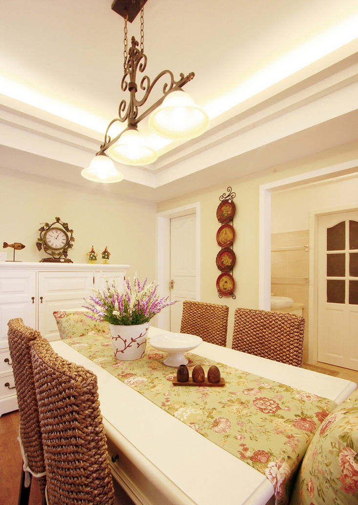 如图所示,值得一提的是采用绿植来装点门帘田园风格装修,在暖色调灯光的照耀下,营造出了一种浓郁的自然风。米黄色墙纸+白色家具的完美融合,浪漫且清新。