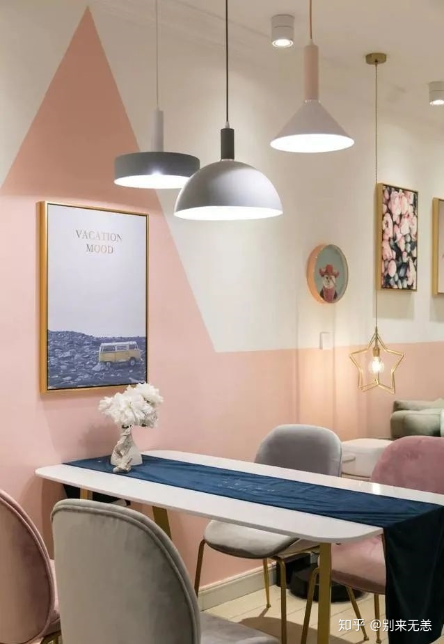 餐厅部分比较亮眼,墙体刷了三角形图案,刚好与餐厅面积大小保持一致,划分出视觉功能区,四张交错摆放的灰粉餐椅,让空间看起来更丰富。