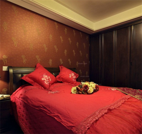 1、大红色的床单搭配实木打造的凸显出中国传统的喜庆元素,棕色的扇形门,别致又新颖,把中国传统的红映衬得更加喜庆,特别有新婚的气氛。