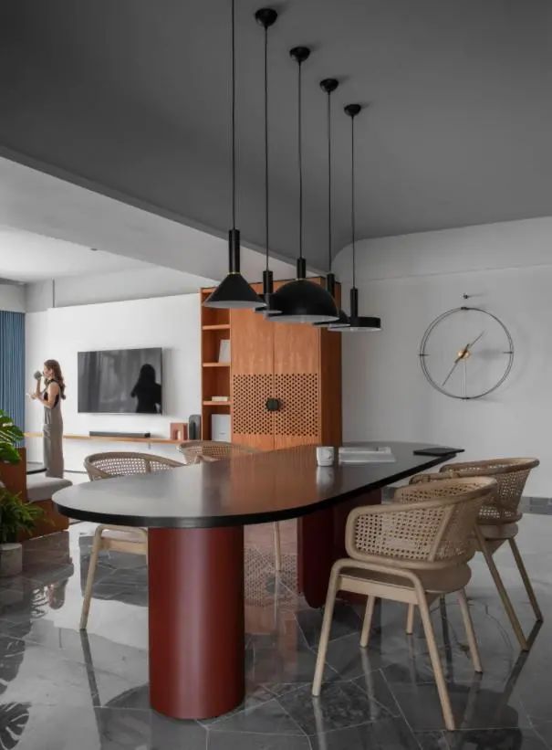 佰富彩给餐厅做了开放式的设计,位于入户门和客厅之间,长弧形的餐桌旁边,摆放木藤状餐椅,夫妻二人完全可以坐得下,丝毫不觉得拥挤。本身家中空间不算太过明亮,便给餐桌上方加吊灯,效果更好。