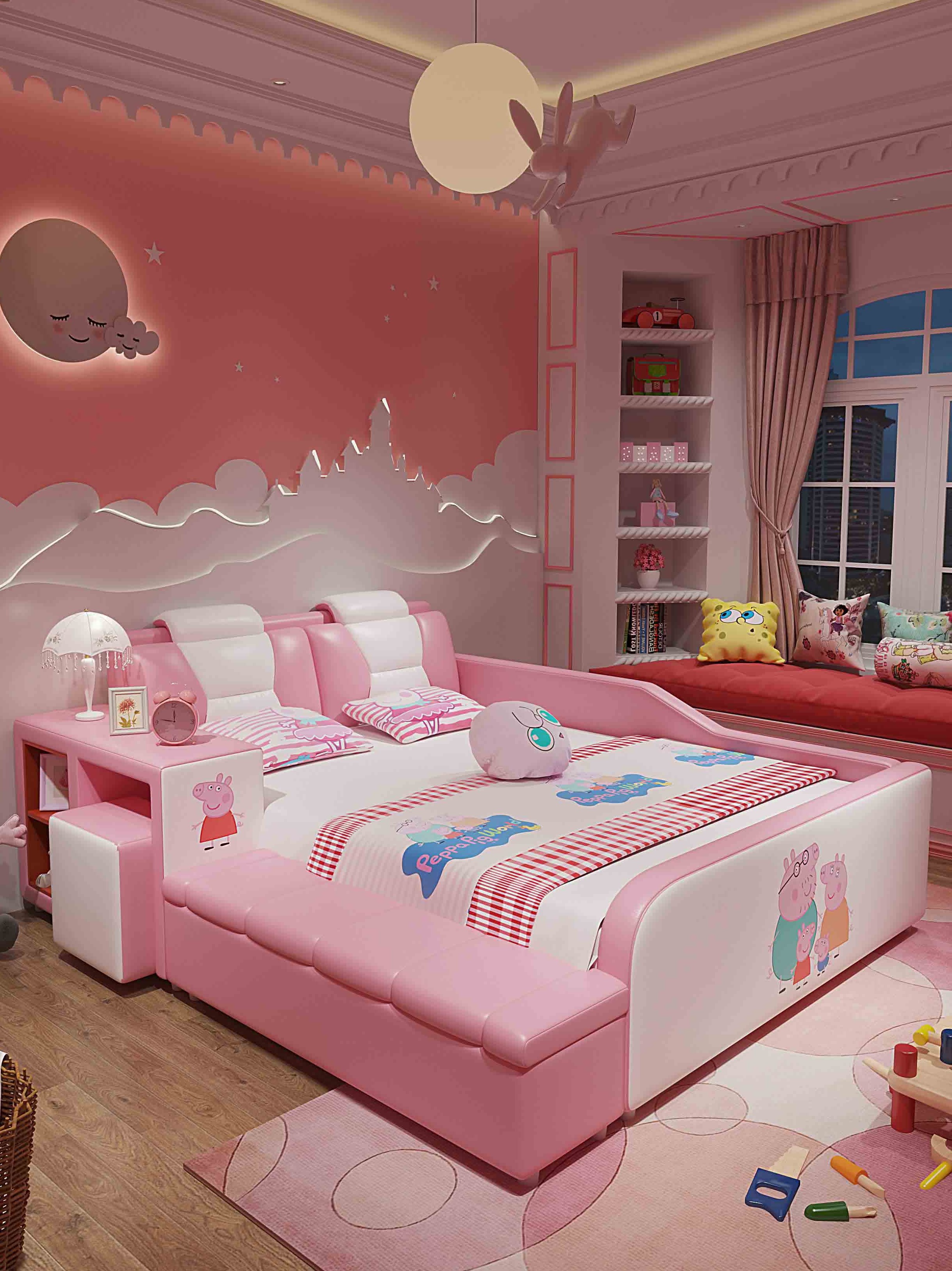 淡紫色的墙面搭配一个榻榻米床,书桌椅也选择了成品的卡通款,床品上有着一些卡通图案,再加上玩偶的点缀,整个儿童房清新而又浪漫。