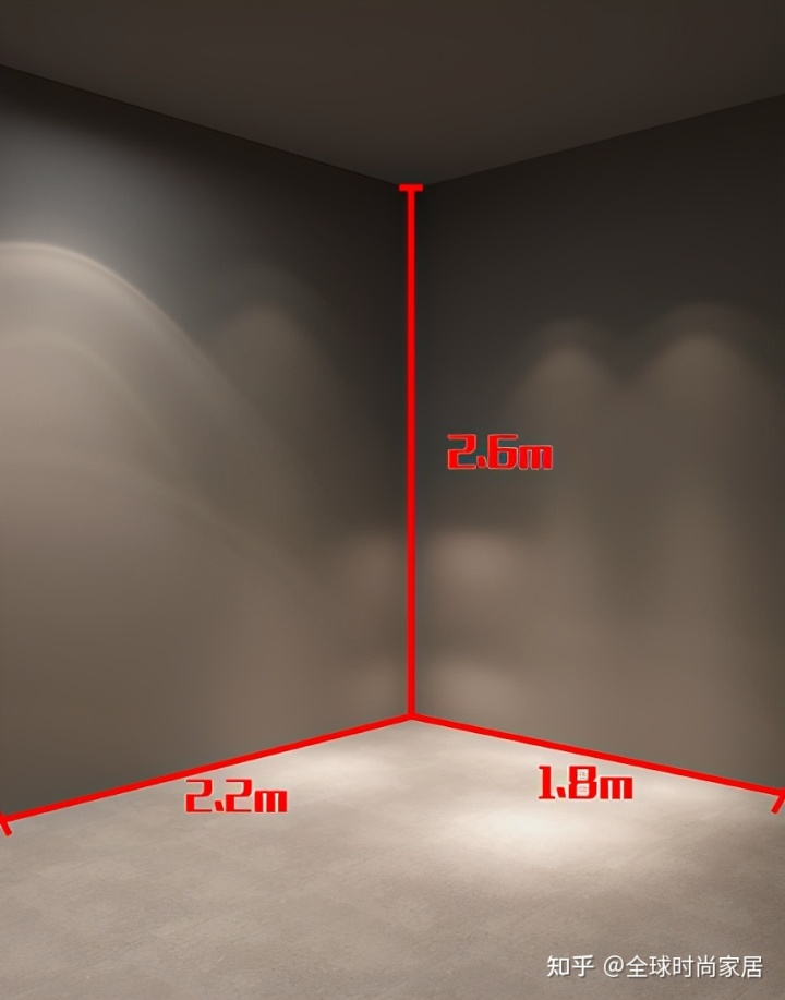 首先看卫生间尺寸:长2.2米,宽1.8米,高2.6米。