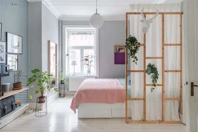 卧室和置物区用隔断架专门隔开,提供一个安静的休闲场地。整个卧室的空间还是比较宽敞通透的,就算住上几十年也不会看腻。
