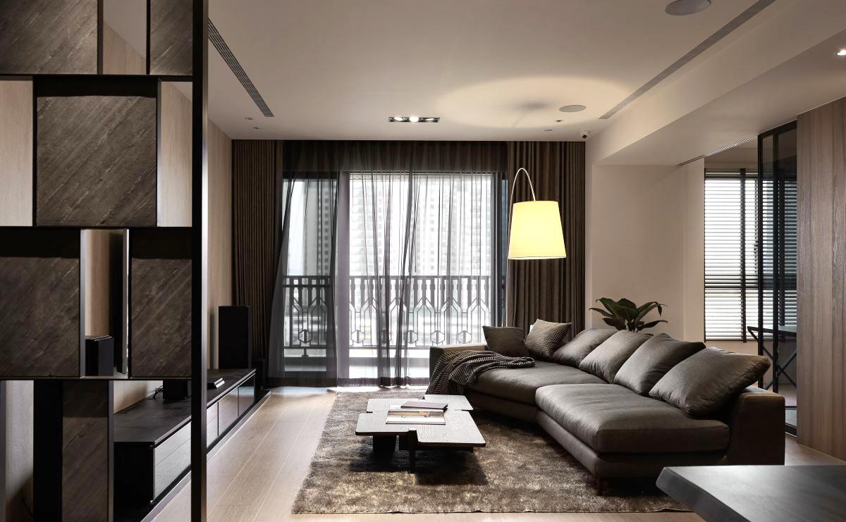客厅中后现代装修效果图佰富彩,简约的设计手法,简约而不简单,充分体现出空间的通透性和趣味性。深灰色布艺沙发,简洁的线条,豪华的材质,体现出一种摩登的贵族气质。