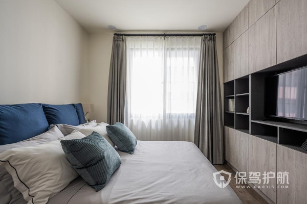 上图是主卧装修效果图。主卧化繁为简的手法整合展示柜体,落下的几何切割线演绎率性感,实用面上纳入摆放电视与陈列品,不同排列组合下创造不同趣味的端景,如柔软波浪状的落地窗帘筛落日光一居室装修效果图一居室装修效果图,营造舒适惬意氛围。