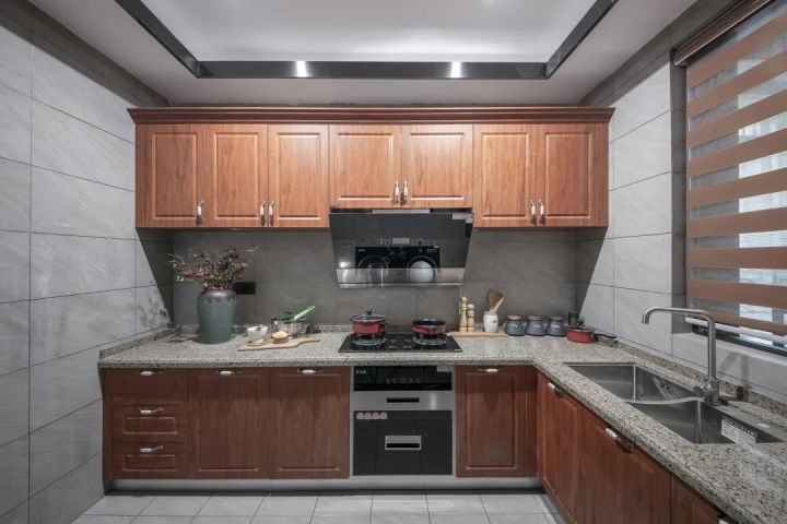 厨房厨房在功能完备的基础上,对空间风格进行了完美的延续,内敛而不失优雅,L型的橱柜,可有序摆放收纳厨具,整洁又实用。