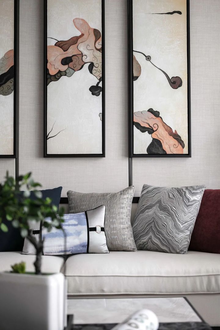 布艺实木沙发搭配三幅拼接的画,沉稳大气。它们在造型、材质等不同元素的运用上巧妙融合,充分展现出现代居室的时尚感。