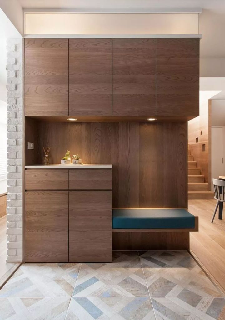 鞋柜分成吊柜与底柜,中央留出穿鞋椅,是收纳+穿鞋的复合式设计。
