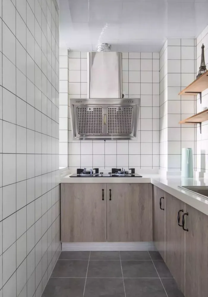 厨房以小白砖搭配浅木纹橱柜,干净又耐看。