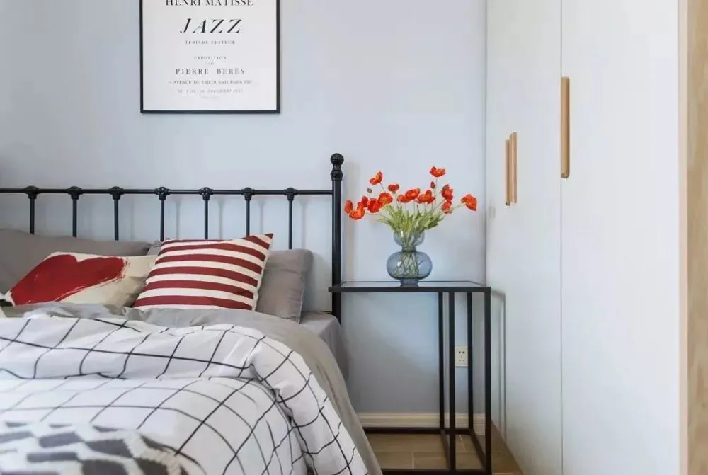 床靠窗摆放,另一侧的空间制定了置顶大衣柜,解决了收纳问题。