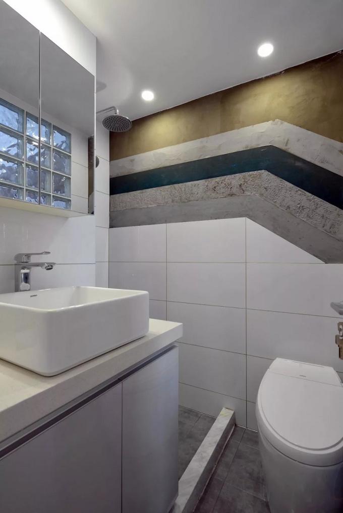 厨房前面就是卫生间的位置,一客厅之间通过玻璃墙做隔断,既遮挡隐私,又保持通透好采光,很有创意!卫生间空间较小,没有做干湿分离设计,淋浴间通过挡水条阻止水流入如厕区,让卫浴空间保持整洁干爽。