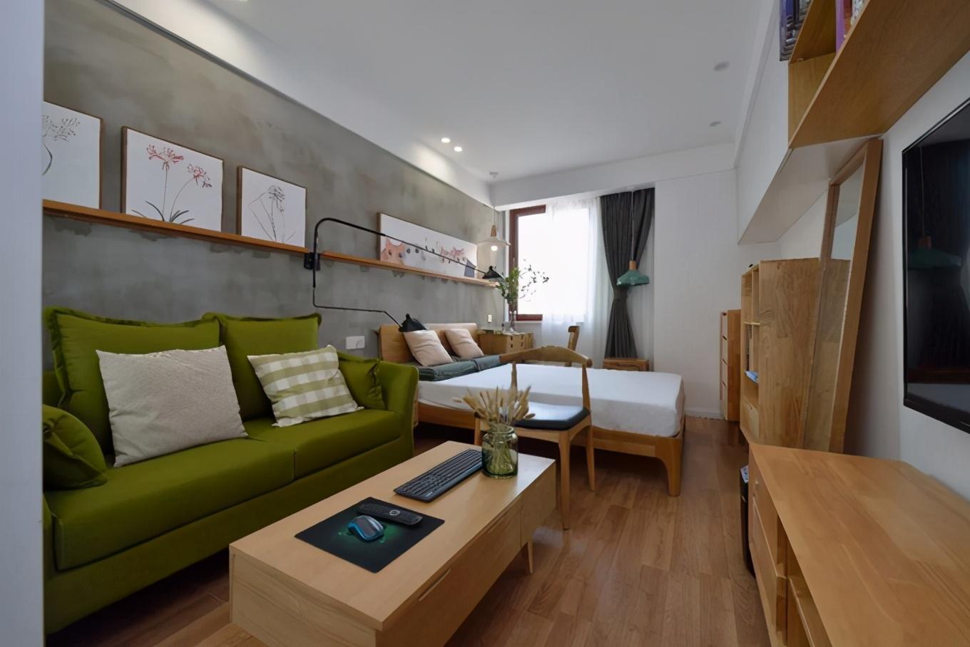 佰富彩客厅摆放着一个鲜艳的绿色双人沙发,墙面摆放着实木茶几,这里即是会客区,同时又兼具餐厅的功能,一个人坐在这里一边用餐,一边看电视很很舒适,也很惬意。