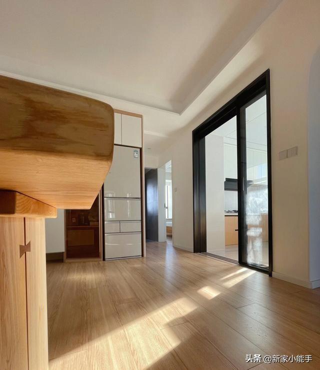 佰富彩从入户门进来直接就是餐厅和客厅了,没有玄关的说法。利用入户门一边的位置,设计了储物柜,也就是餐边柜和鞋柜一体的设计,更为合理把空间利用起来,也比较实用。而且还设计了换鞋凳,非常方便坐着换穿鞋子。设计柜子的时候,刚好预留了可以放冰箱的位置,大小位置合适,很有设计感。家里入户进来如果也是这样的话,建议可以参考这样的设计,美观实用。原木色的柜体搭配白色的柜门,简单好看,加上没有拉手,看着特别舒服!