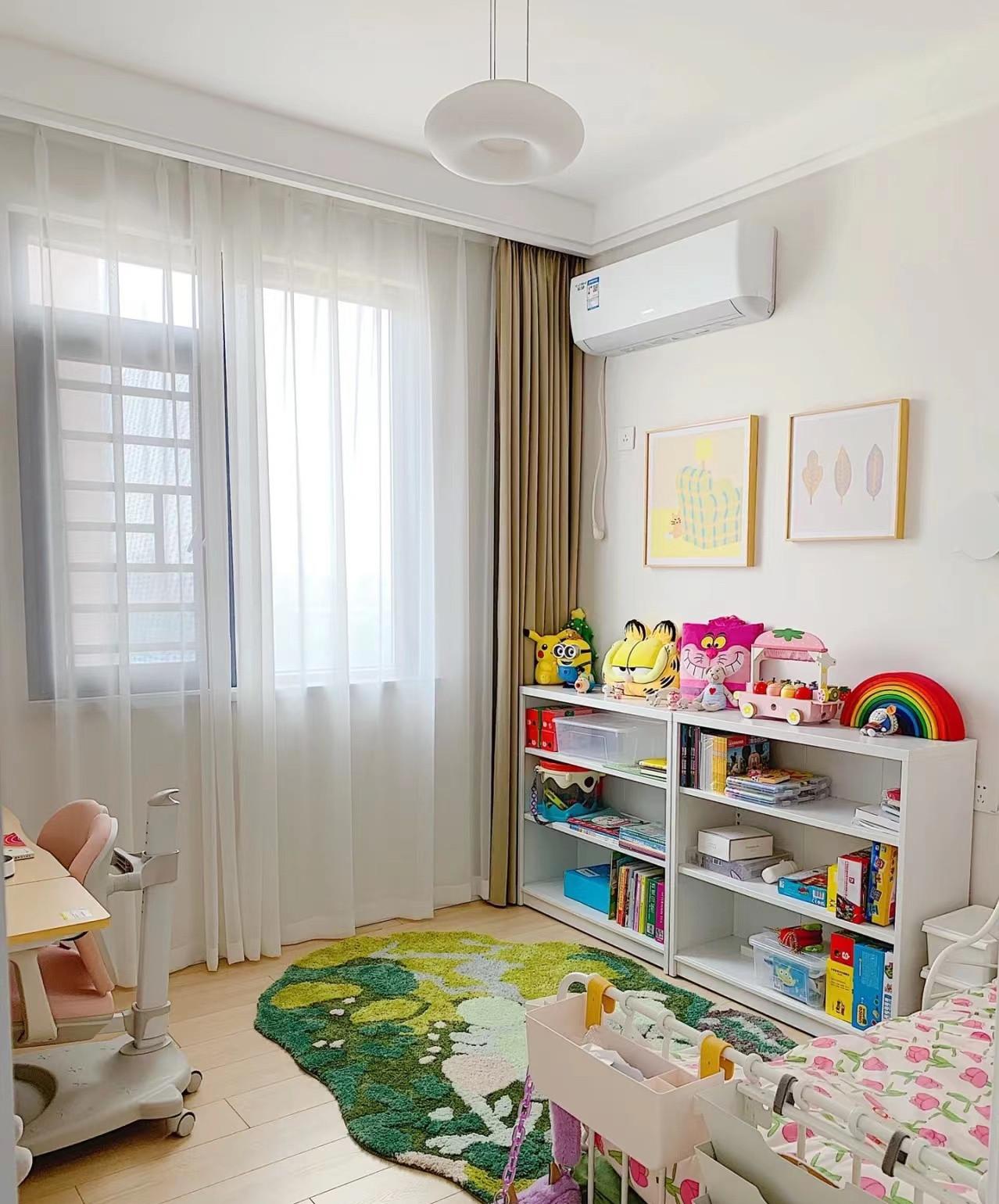 这间是儿童房,硬装风格跟其他空间一样,都是大白墙加上双眼皮吊顶,简单大方,靠着墙壁摆放了一张白色的铁艺小床,搭配花朵床品,可爱又俏皮,墙上挂了云朵和树叶装饰画,增加童趣和自然气息,床右侧摆放了两个书架,用来摆放小朋友的绘本和玩具,方便拿放,床尾摆放了一张小书桌,方便孩子看书学习,这样的布置虽然普通,但是满是家的烟火气,充满了生活气息,让人感觉舒适又放松。