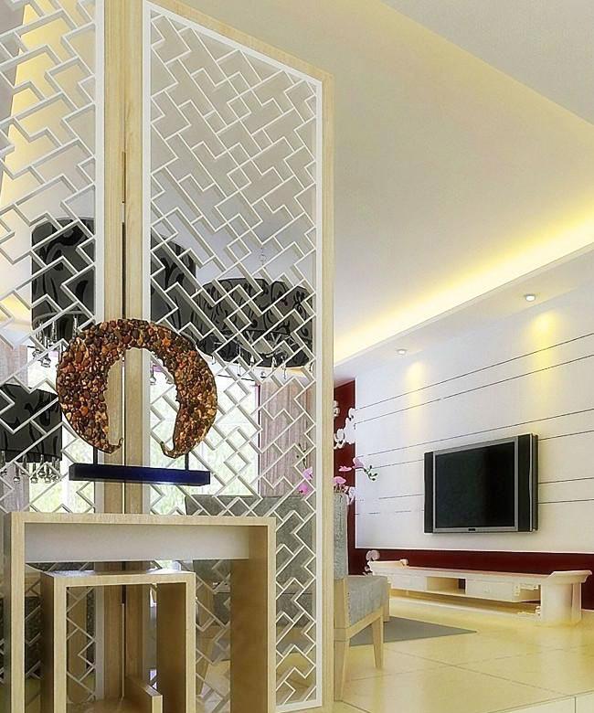 4、半敞半蔽式:是以隔断下部为完全遮蔽式设计。隔断两侧隐蔽无法通透,上端敞开,贯通彼此相连的天花顶棚。半敞半隐式的隔断墙高度大多为1。5m,通过线条的凹凸变化、墙面挂置壁饰或采用浮雕等装饰物的布置,从而达到浓厚的艺术效果。