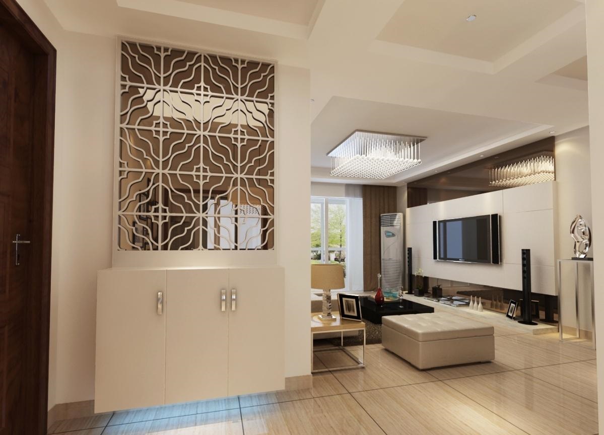 客厅玄关装修效果图:中国的传统大宅院入门之处均设有大型玄关,而现代都市的住宅普遍面积狭窄,若再设置传统的大型玄关,则明显会感觉空间局促,难以腾挪。所以折中的办法是用玻璃屏风来作间隔,这样即可防止外气从大门直冲入客厅,同时也可令狭窄的玄关不显得太逼仄。