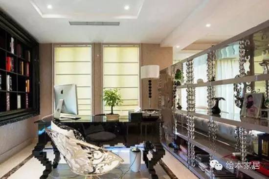 开放式的书房,其实主要是以办公为主,右手边是客厅和办公区域的镂空隔断,非常惊艳的设计,上方还可以作摆设用,既美观又实用。