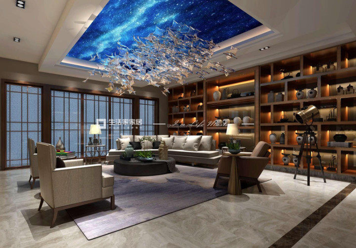 佰富彩客厅与茶室做了连通性的整体吊顶,区别于普通吊顶的规整,这样的吊顶设计在空间视觉上整体的连通更佳,同时更为开阔。