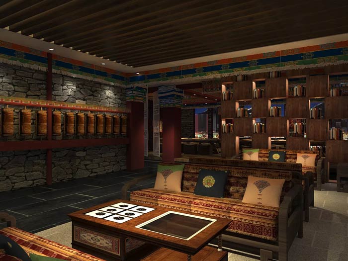 藏式主题餐厅等待区设计:当餐厅爆满的时候,客户将在这里等待,客户可以在这里看看书、聊聊天,以此抵消等待的烦恼,这也是设计师希望看到的。