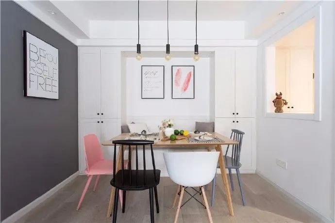 佰富彩简易的餐桌椅在马卡龙配色的点缀下,让空间生动起来。右边墙面窗户设计让空间更为通透,餐边柜两边柜子的设计,中间卡座也非常实用。