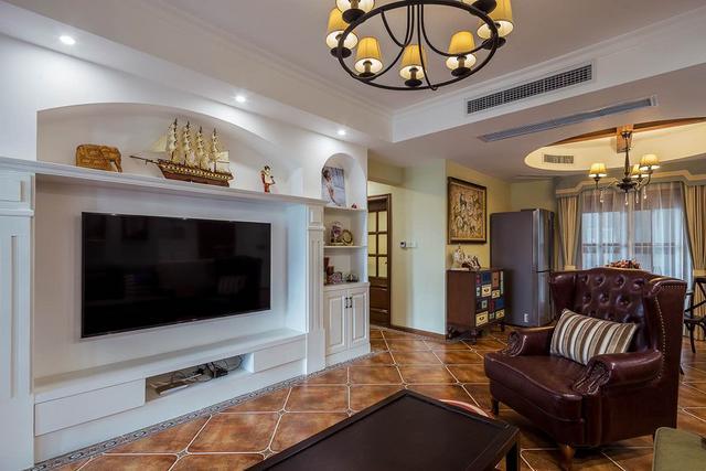 电视墙是现场定做的,木工板上的白漆,用石膏板做造型,再定制柜门......做出了美式的质感和镂空的隔板,女主人是一个收纳狂人,所以在设计背景墙时也考虑了储物功能。