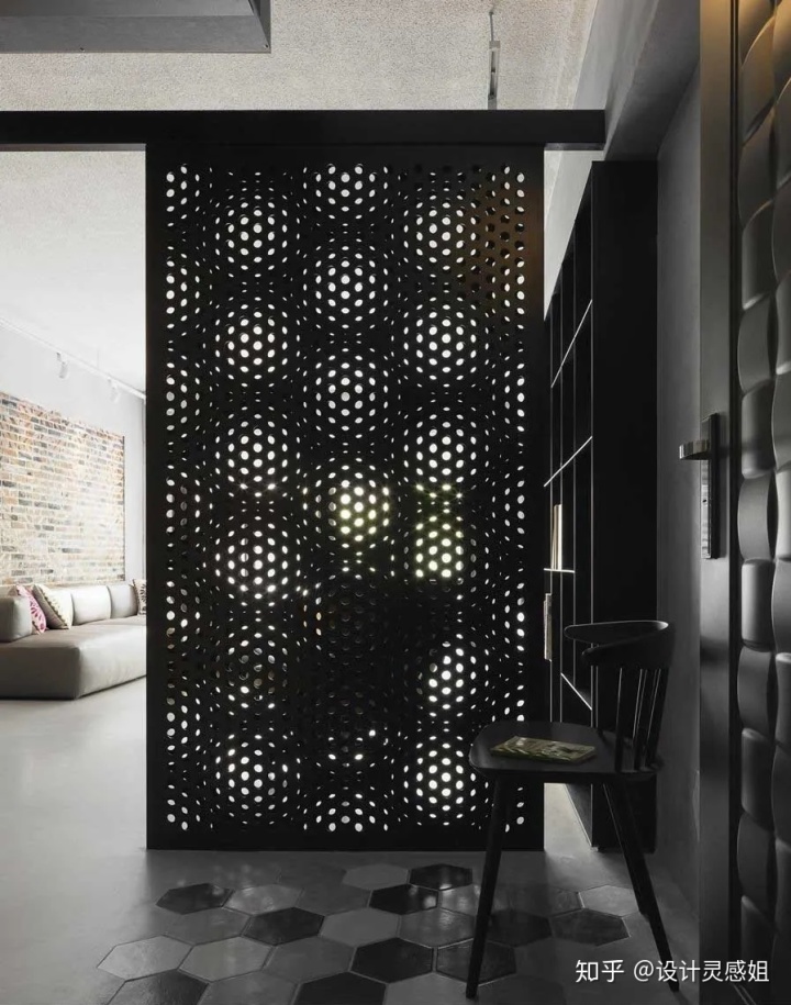 ▼ 铁艺隔断做出小圆孔引流光线,搭配六角地砖,为空间定调Loft风格。