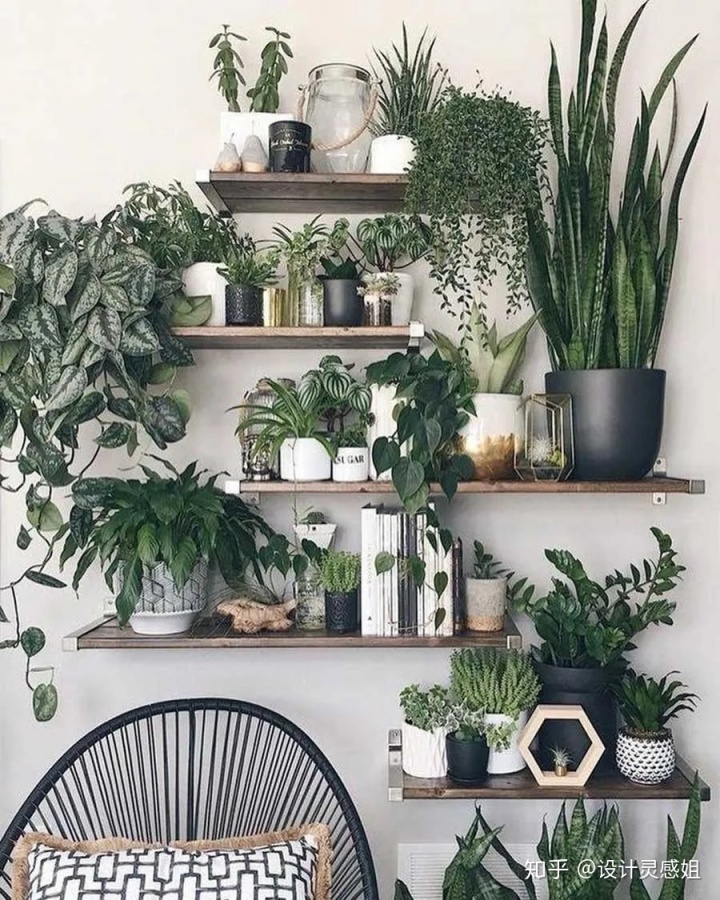 佰富彩▼ 置物架上的绿植盆栽,为玄关注入自然气息,也成就一道绿色的端景墙。