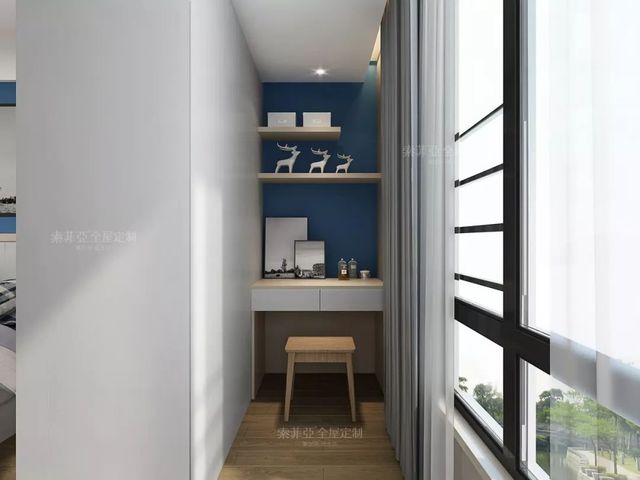 主卧打通了旁边的房间,做了书房,定做了书桌,连接着大衣柜,都是白色的,看起来很干净净自然,还摆放了一盏透明玻璃的台灯,时尚美观。简单的布置一番就方便工作学习了。