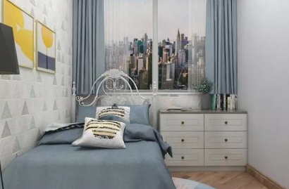 次卧空间去除了笨重的大衣柜,小巧的床头斗柜让房间视野更加开阔,简欧造型的单人床搭配简单的床品,空间更加舒适。
