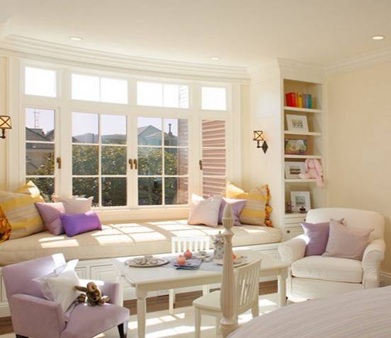 阳台飘窗设计效果图一:阳台飘窗设计效果图二:利用这个大的阳台并改造成了小小的书房,在这里的采光性和通风性特别好,宿舍的窗帘和纱帘的使用让这个小小的书房变得清雅起来,这个集...